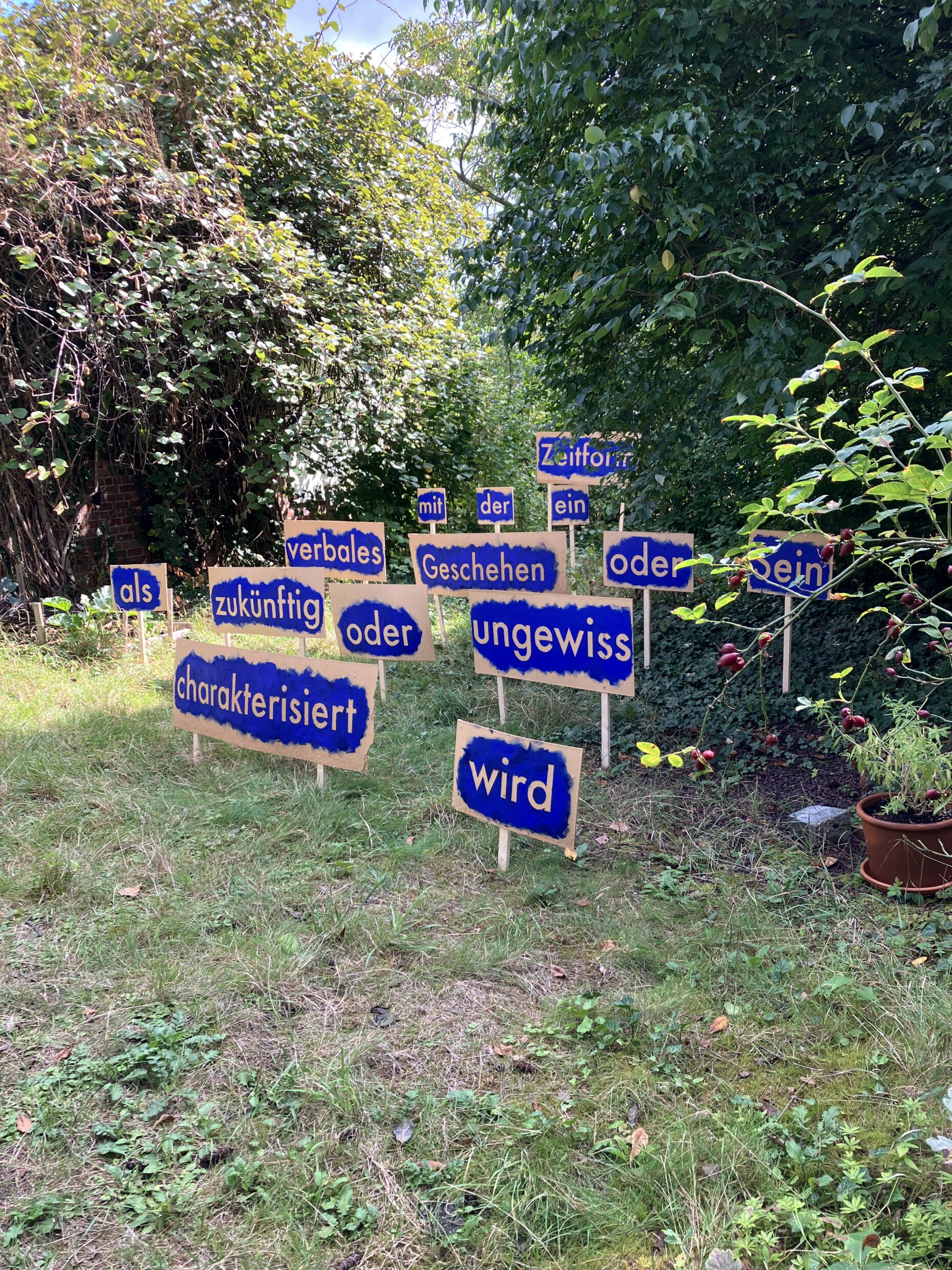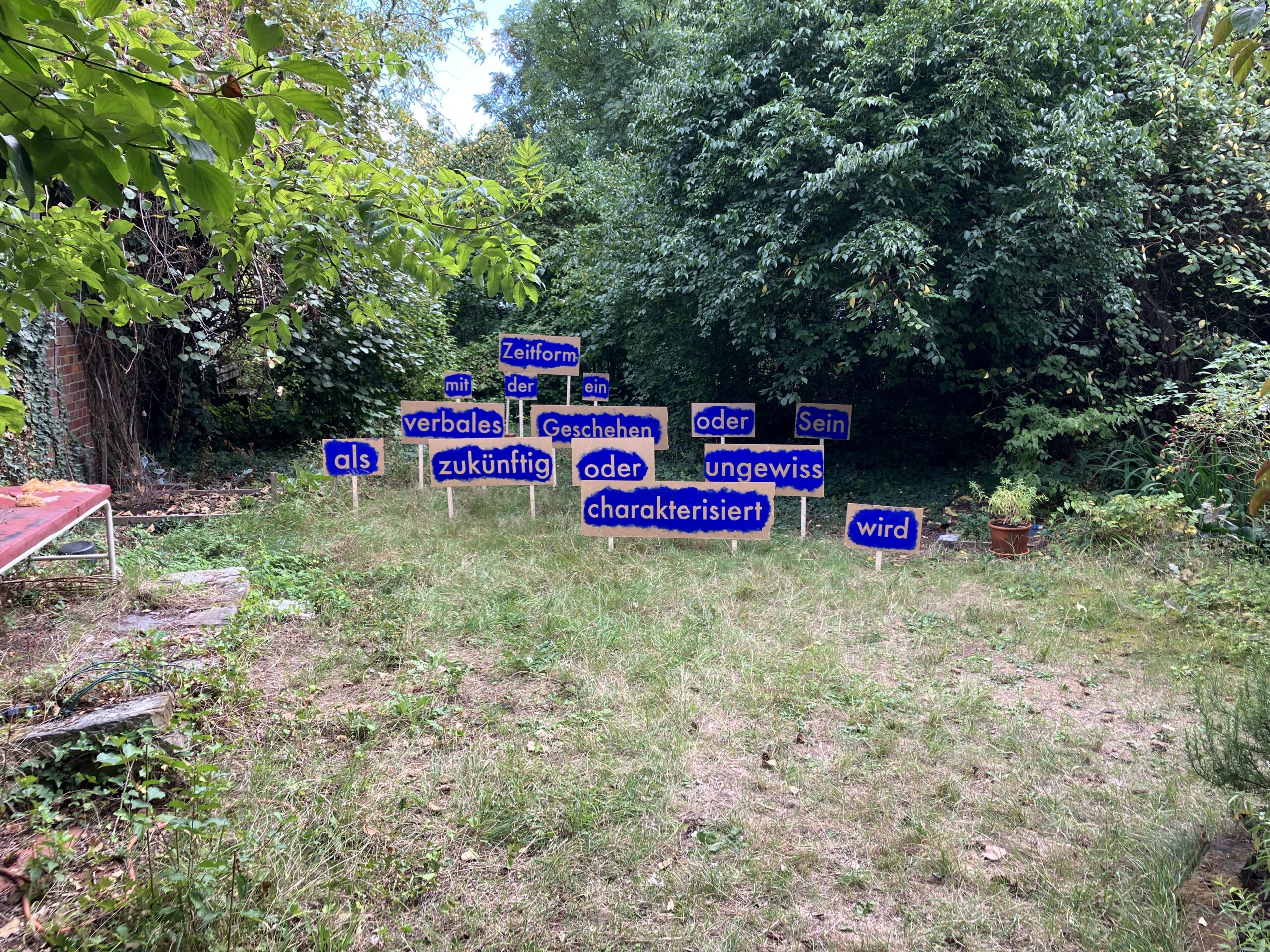 Auf vierzehn Schildern, im naturbelassenen Garten der Simultanhalle, arrangiert in